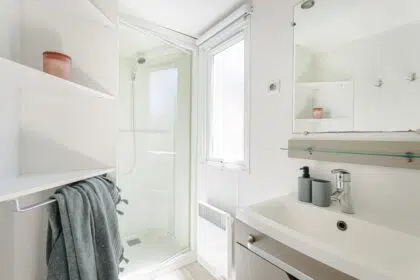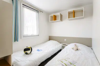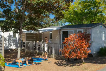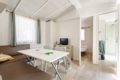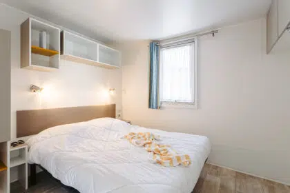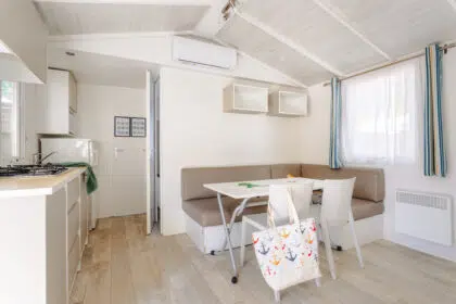 Installez-vous confortablement sur la terrasse en bois semi-couverte, aménagée avec un salon de jardin et des transats pour savourer vos instants de plein air. À l’intérieur, tout est prêt pour un séjour sans souci : draps, serviettes et tapis de bain sont fournis. Le mobil-home dispose également de la climatisation, du chauffage et d’une télévision pour un confort optimal en toute saison.