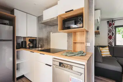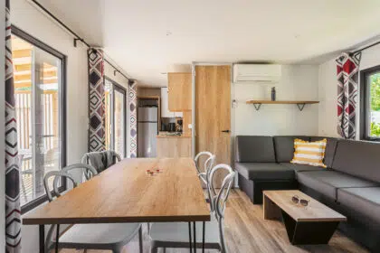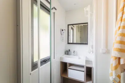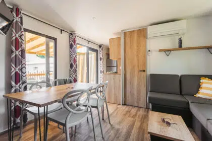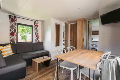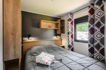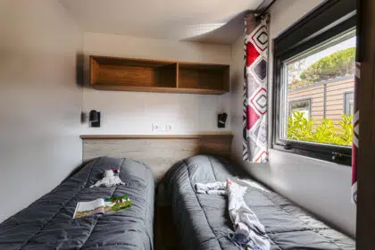 Côté couchages, le mobil-home offre un lit double avec liseuse (160 cm), deux lits simples (80 cm) et un lit gigogne — parfait pour les séjours en famille. Climatisation et chauffage assurent un bien-être optimal en toute saison.