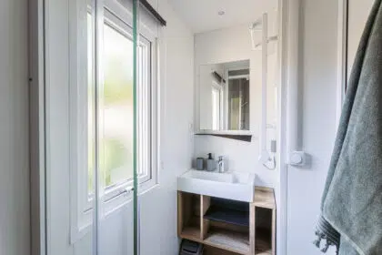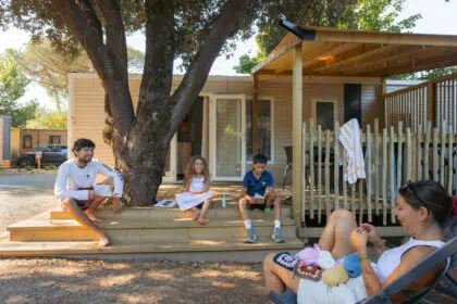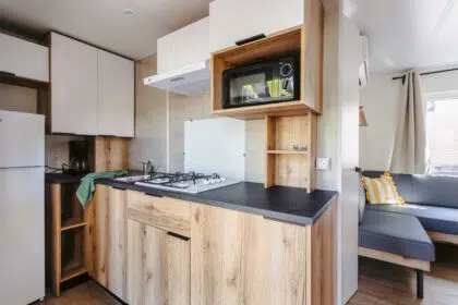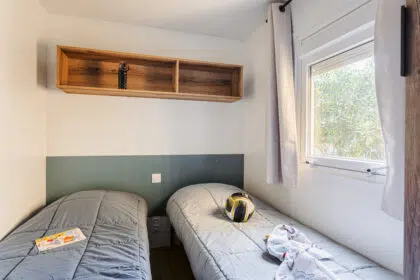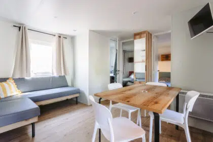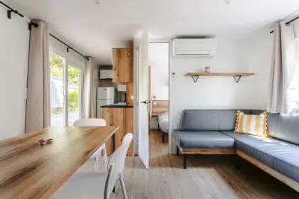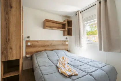 Côté couchages, le mobil-home comprend un lit double (140 cm), deux lits simples (80 cm) et un lit gigogne, idéal pour les séjours en famille. Climatisation et chauffage vous garantissent un confort optimal, quelle que soit la saison.