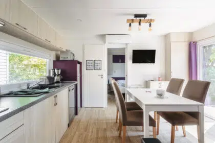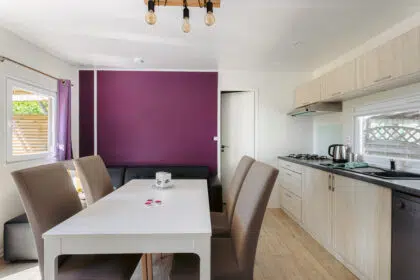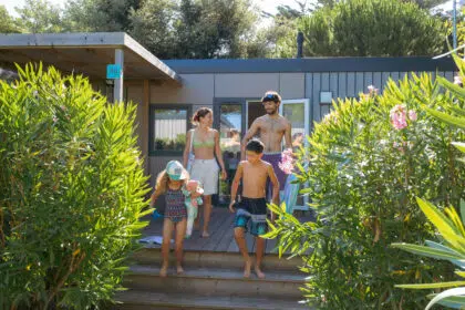 Profitez d’un bel espace extérieur grâce à la terrasse podium en bois semi-couverte, équipée d’un salon de jardin et de transats pour vos moments de détente. À l’intérieur, confort et praticité sont au rendez-vous : draps, serviettes et tapis de bain sont fournis, et deux salles de bains facilitent la vie à plusieurs.