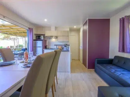 Appréciez le confort d’une terrasse podium en bois semi-couverte, idéale pour vos moments de détente, avec salon de jardin et transats à disposition. À l’intérieur, tout est pensé pour votre bien-être : draps, serviettes et tapis de bain sont fournis, et vous disposez de deux salles de bains et deux toilettes pour plus de confort au quotidien.